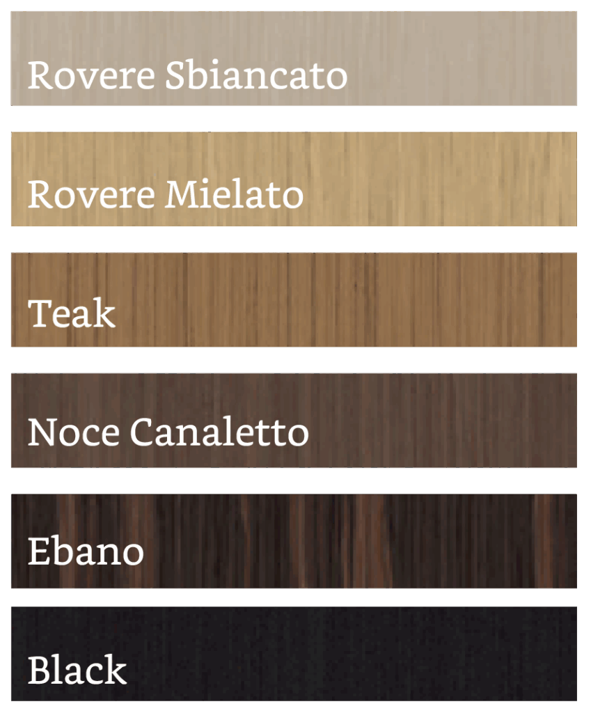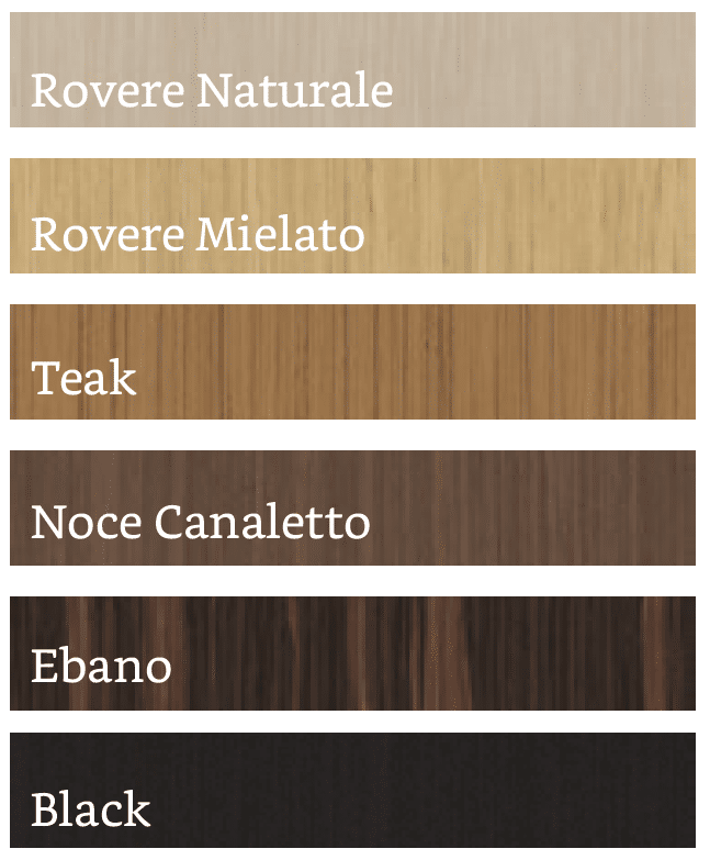 - 6 essenze di precomposto per mantenere omogeneità di colore nel tempo: Rovere Chiaro, Rovere Mielato, Teak, Noce Canaletto, Ebano, Black