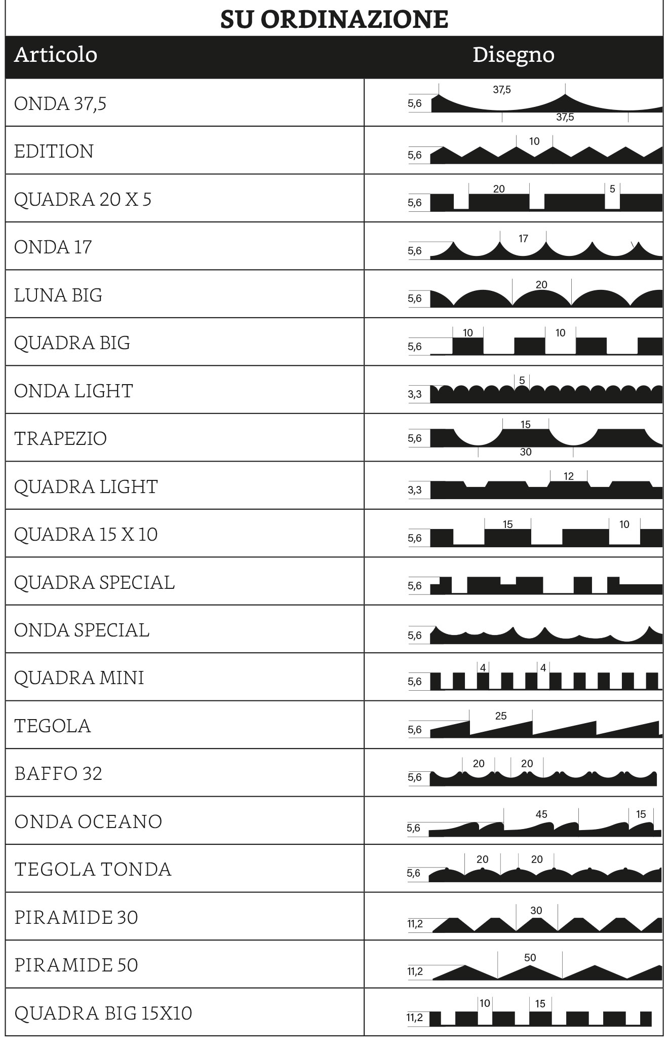 - 6 essenze in spessore 5.6 mm fresate: consegna entro 7/10 giorni lavorativi.